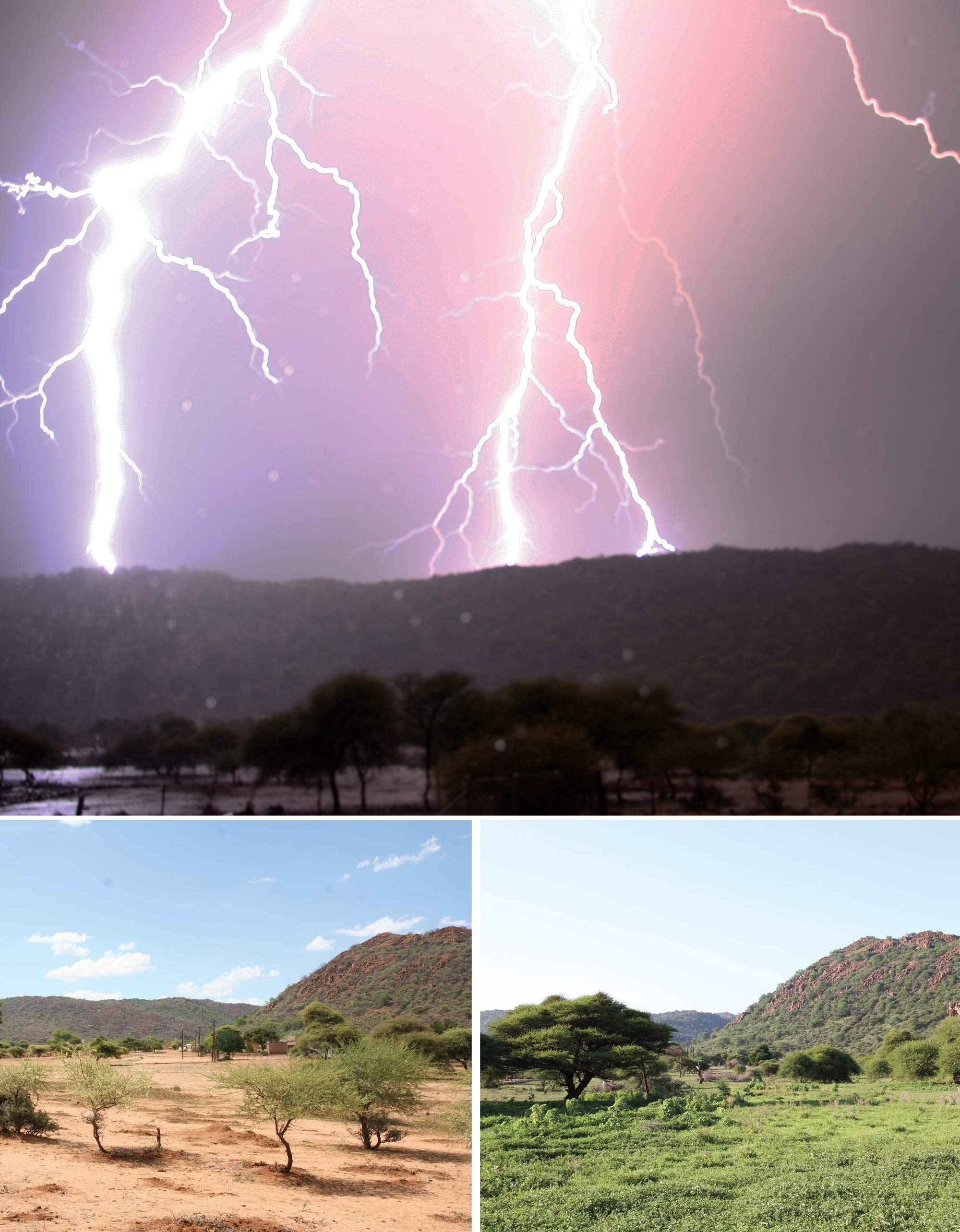 Thunderstorm over the Shoshong hills, and photographs of Shoshong in Nov 2013 and Jan 2014 showing the effect of rainfall.